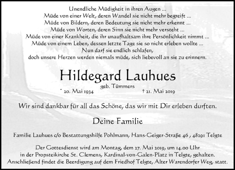 Hier finden Sie alle Traueranzeigen aus der Zeitung, die bisher für Hildegard Lauhues erschienen sind. Weitere Traueranzeigen, die in der Zeitung erscheinen, werden hier ebenfalls aufgelistet