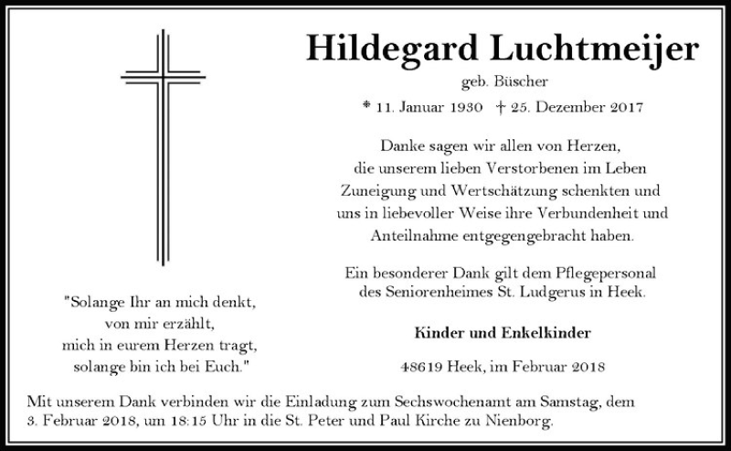Hier finden Sie alle Traueranzeigen aus der Zeitung, die bisher für Hildegard Luchtmeijer erschienen sind. Weitere Traueranzeigen, die in der Zeitung erscheinen, werden hier ebenfalls aufgelistet