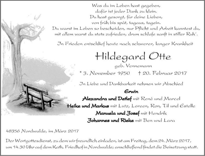 Hier finden Sie alle Traueranzeigen aus der Zeitung, die bisher für Hildegard Otte erschienen sind. Weitere Traueranzeigen, die in der Zeitung erscheinen, werden hier ebenfalls aufgelistet