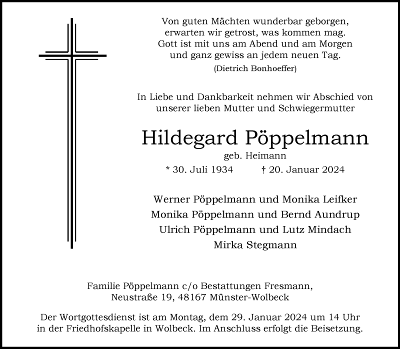 Hier finden Sie alle Traueranzeigen aus der Zeitung, die bisher für Hildegard Pöppelmann erschienen sind. Weitere Traueranzeigen, die in der Zeitung erscheinen, werden hier ebenfalls aufgelistet