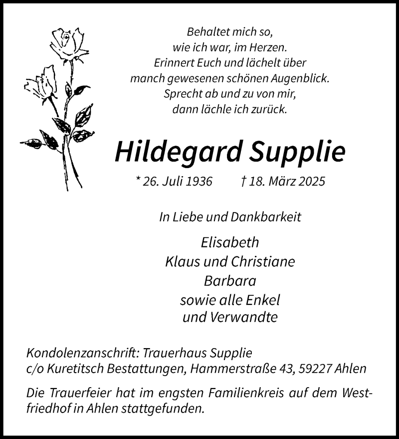 Hier finden Sie alle Traueranzeigen aus der Zeitung, die bisher für Hildegard Supplie erschienen sind. Weitere Traueranzeigen, die in der Zeitung erscheinen, werden hier ebenfalls aufgelistet