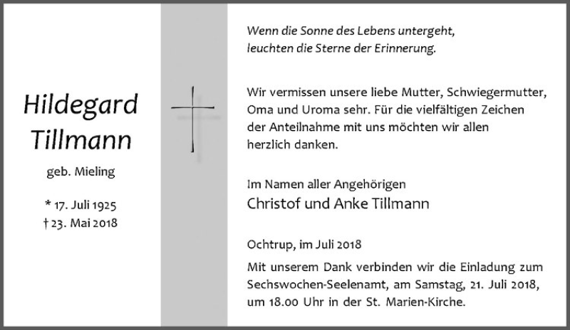 Hier finden Sie alle Traueranzeigen aus der Zeitung, die bisher für Hildegard Tillmann erschienen sind. Weitere Traueranzeigen, die in der Zeitung erscheinen, werden hier ebenfalls aufgelistet