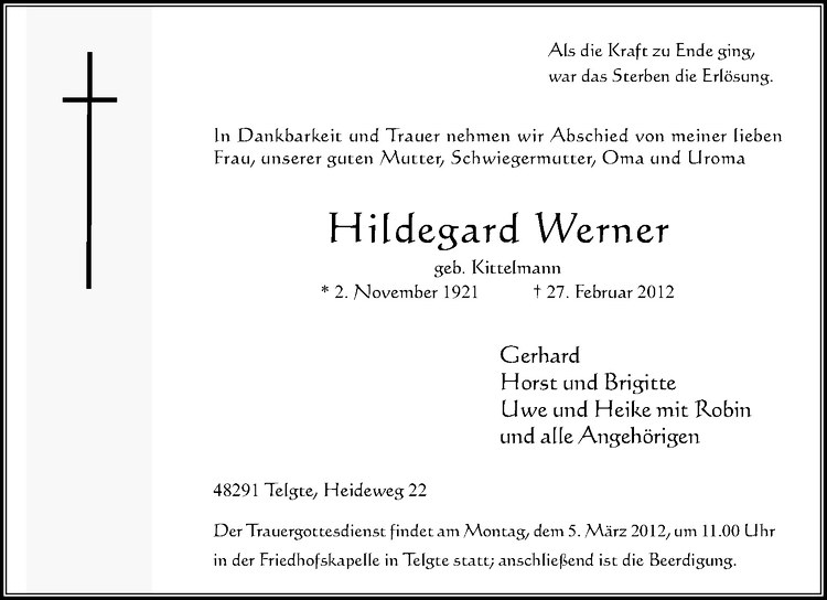 Hier finden Sie alle Traueranzeigen aus der Zeitung, die bisher für Hildegard Werner erschienen sind. Weitere Traueranzeigen, die in der Zeitung erscheinen, werden hier ebenfalls aufgelistet