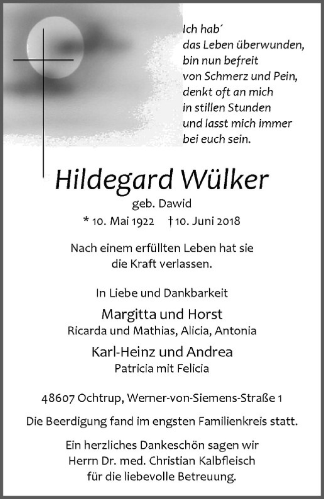 Hier finden Sie alle Traueranzeigen aus der Zeitung, die bisher für Hildegard Wülker erschienen sind. Weitere Traueranzeigen, die in der Zeitung erscheinen, werden hier ebenfalls aufgelistet