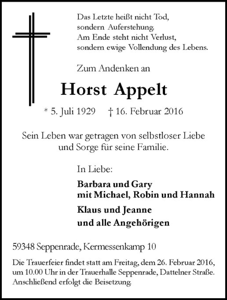 Hier finden Sie alle Traueranzeigen aus der Zeitung, die bisher für Horst Appelt erschienen sind. Weitere Traueranzeigen, die in der Zeitung erscheinen, werden hier ebenfalls aufgelistet