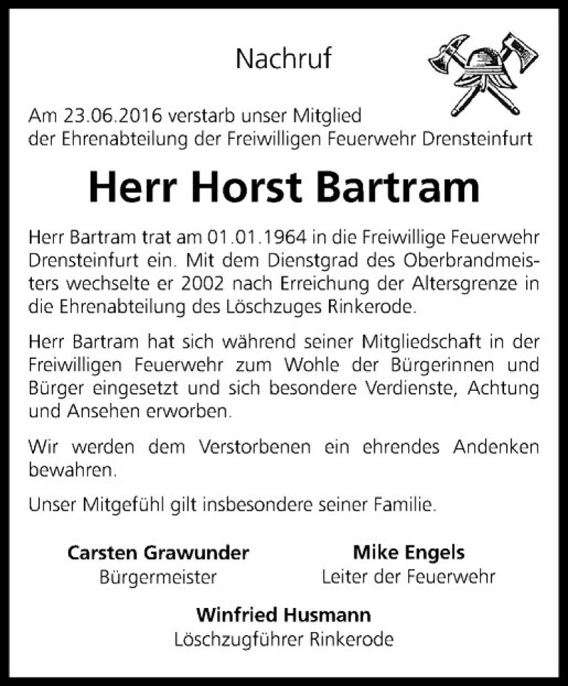 Hier finden Sie alle Traueranzeigen aus der Zeitung, die bisher für Horst Bartram erschienen sind. Weitere Traueranzeigen, die in der Zeitung erscheinen, werden hier ebenfalls aufgelistet