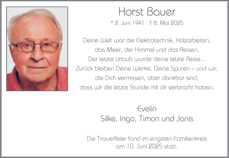 Hier finden Sie alle Traueranzeigen aus der Zeitung, die bisher für Horst Bauer erschienen sind. Weitere Traueranzeigen, die in der Zeitung erscheinen, werden hier ebenfalls aufgelistet