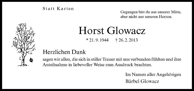 Hier finden Sie alle Traueranzeigen aus der Zeitung, die bisher für Horst Glowacz erschienen sind. Weitere Traueranzeigen, die in der Zeitung erscheinen, werden hier ebenfalls aufgelistet