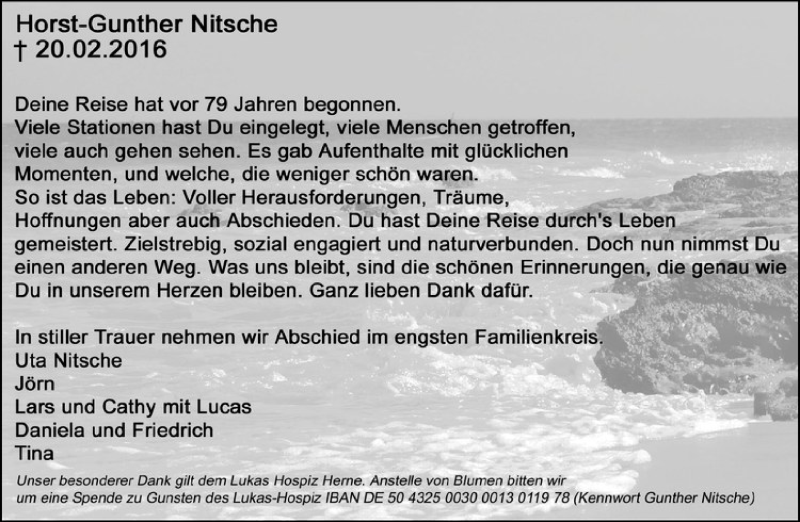 Hier finden Sie alle Traueranzeigen aus der Zeitung, die bisher für Horst-Gunther Nitsche erschienen sind. Weitere Traueranzeigen, die in der Zeitung erscheinen, werden hier ebenfalls aufgelistet