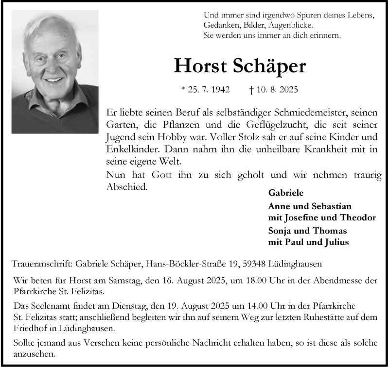 Hier finden Sie alle Traueranzeigen aus der Zeitung, die bisher für Horst Schäper erschienen sind. Weitere Traueranzeigen, die in der Zeitung erscheinen, werden hier ebenfalls aufgelistet