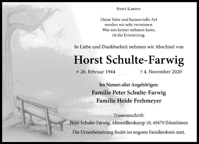 Hier finden Sie alle Traueranzeigen aus der Zeitung, die bisher für Horst Schulte-Farwig erschienen sind. Weitere Traueranzeigen, die in der Zeitung erscheinen, werden hier ebenfalls aufgelistet