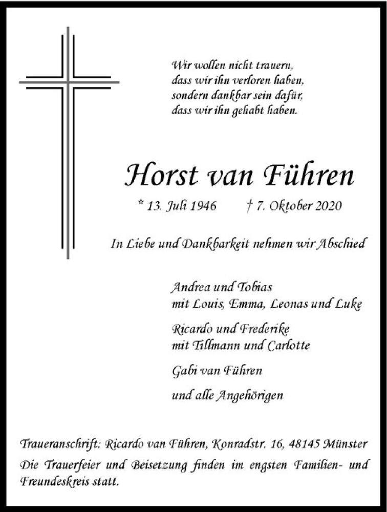 Hier finden Sie alle Traueranzeigen aus der Zeitung, die bisher für Horst van Führen erschienen sind. Weitere Traueranzeigen, die in der Zeitung erscheinen, werden hier ebenfalls aufgelistet