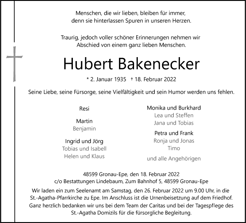 Hier finden Sie alle Traueranzeigen aus der Zeitung, die bisher für Hubert Bakenecker erschienen sind. Weitere Traueranzeigen, die in der Zeitung erscheinen, werden hier ebenfalls aufgelistet