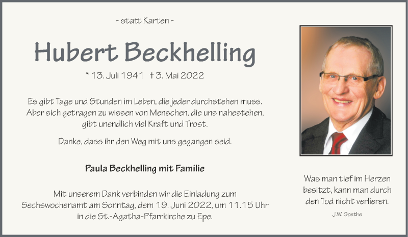 Hier finden Sie alle Traueranzeigen aus der Zeitung, die bisher für Hubert Beckhelling erschienen sind. Weitere Traueranzeigen, die in der Zeitung erscheinen, werden hier ebenfalls aufgelistet