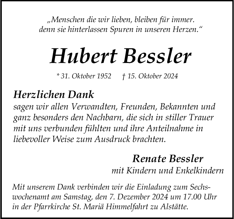 Hier finden Sie alle Traueranzeigen aus der Zeitung, die bisher für Hubert Bessler erschienen sind. Weitere Traueranzeigen, die in der Zeitung erscheinen, werden hier ebenfalls aufgelistet