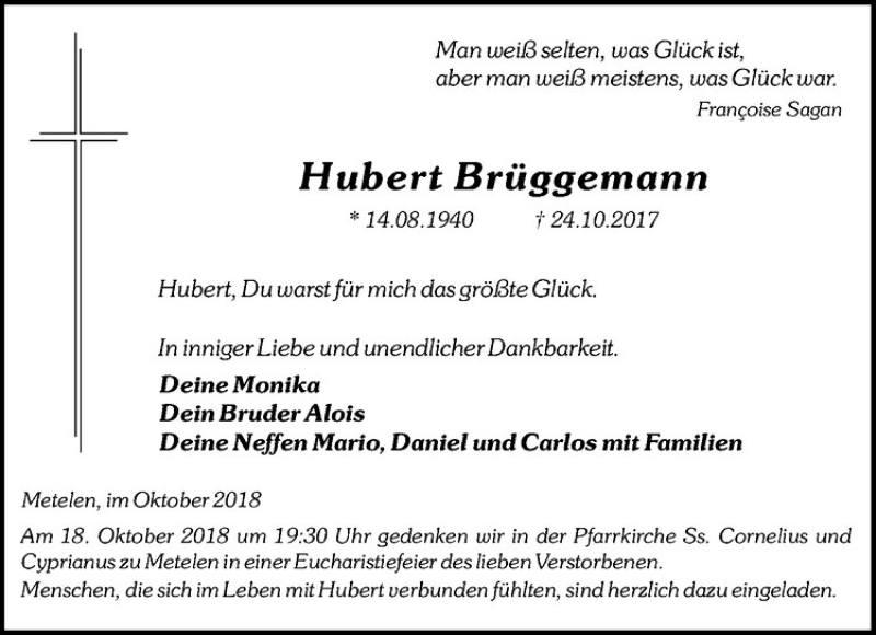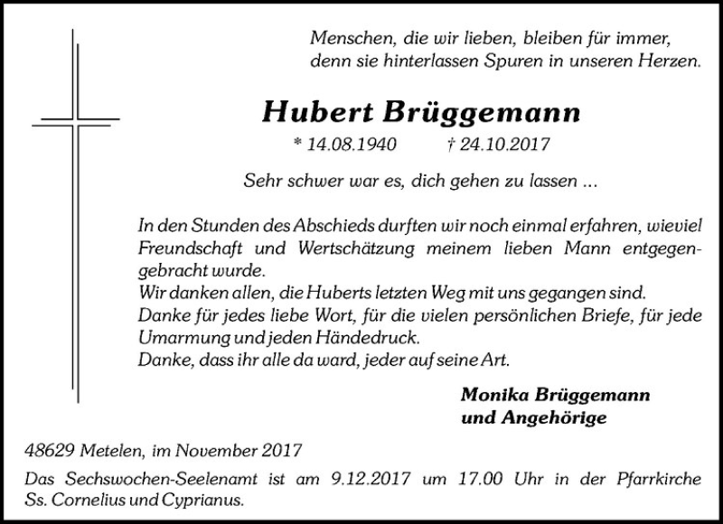 Hier finden Sie alle Traueranzeigen aus der Zeitung, die bisher für Hubert Brüggemann erschienen sind. Weitere Traueranzeigen, die in der Zeitung erscheinen, werden hier ebenfalls aufgelistet