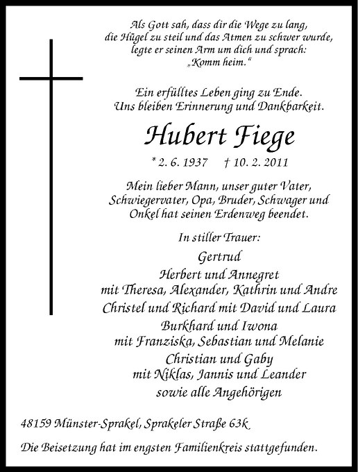 Hier finden Sie alle Traueranzeigen aus der Zeitung, die bisher für Hubert Fiege erschienen sind. Weitere Traueranzeigen, die in der Zeitung erscheinen, werden hier ebenfalls aufgelistet
