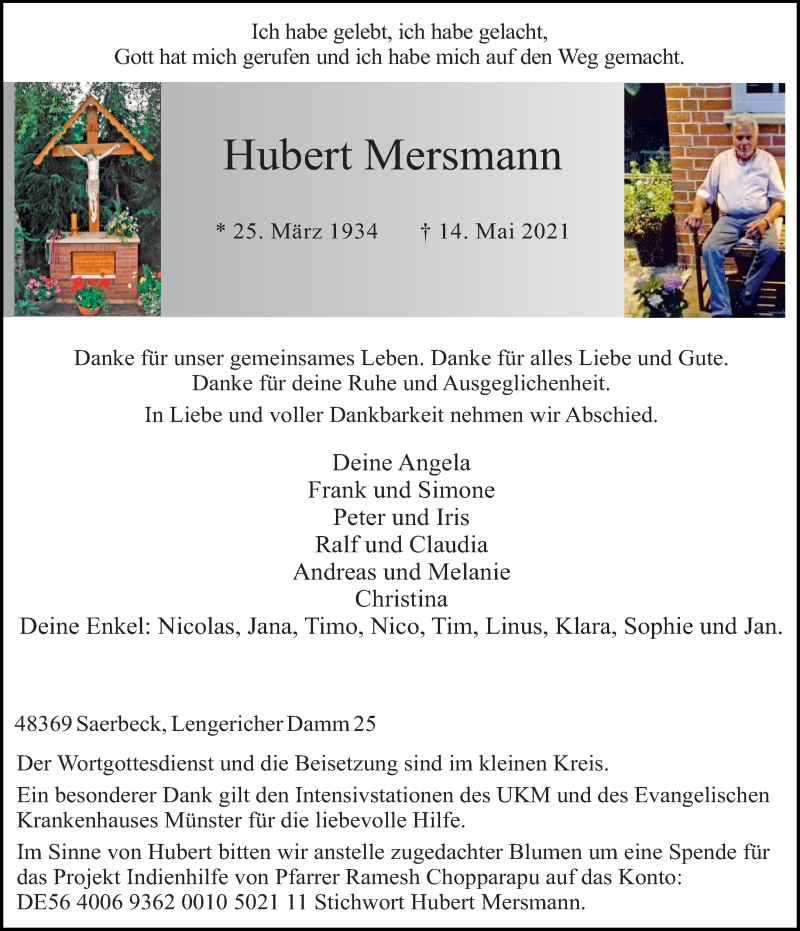Hier finden Sie alle Traueranzeigen aus der Zeitung, die bisher für Hubert Mersmann erschienen sind. Weitere Traueranzeigen, die in der Zeitung erscheinen, werden hier ebenfalls aufgelistet