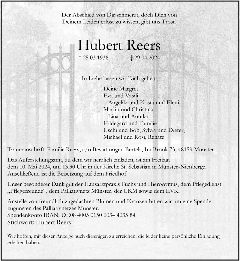 Hier finden Sie alle Traueranzeigen aus der Zeitung, die bisher für Hubert Reers erschienen sind. Weitere Traueranzeigen, die in der Zeitung erscheinen, werden hier ebenfalls aufgelistet