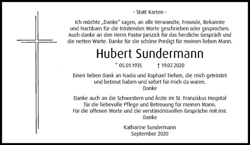 Hier finden Sie alle Traueranzeigen aus der Zeitung, die bisher für Hubert Sundermann erschienen sind. Weitere Traueranzeigen, die in der Zeitung erscheinen, werden hier ebenfalls aufgelistet