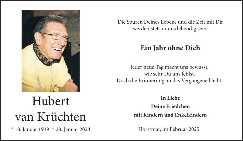 Hier finden Sie alle Traueranzeigen aus der Zeitung, die bisher für Hubert van Krüchten erschienen sind. Weitere Traueranzeigen, die in der Zeitung erscheinen, werden hier ebenfalls aufgelistet