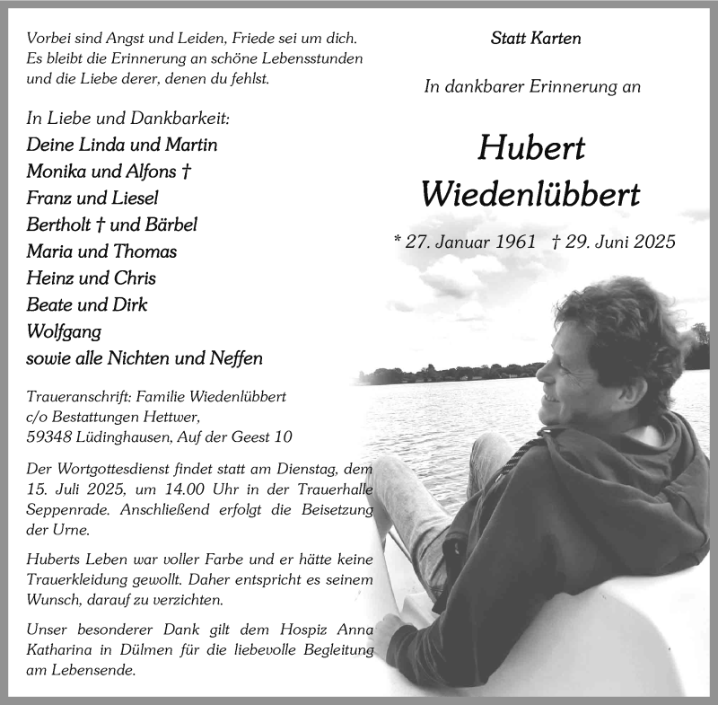 Hier finden Sie alle Traueranzeigen aus der Zeitung, die bisher für Hubert Wiedenlübbert erschienen sind. Weitere Traueranzeigen, die in der Zeitung erscheinen, werden hier ebenfalls aufgelistet