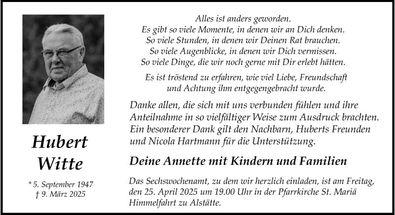 Hier finden Sie alle Traueranzeigen aus der Zeitung, die bisher für Hubert Witte erschienen sind. Weitere Traueranzeigen, die in der Zeitung erscheinen, werden hier ebenfalls aufgelistet