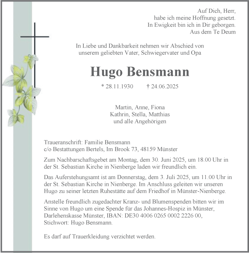 Hier finden Sie alle Traueranzeigen aus der Zeitung, die bisher für Hugo Bensmann erschienen sind. Weitere Traueranzeigen, die in der Zeitung erscheinen, werden hier ebenfalls aufgelistet
