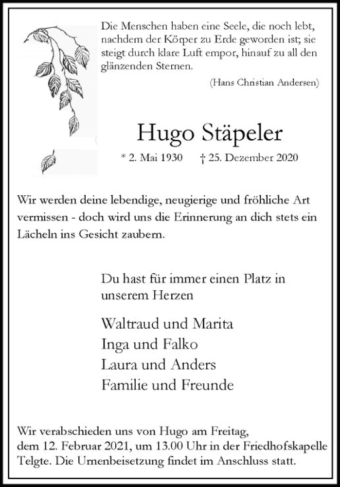 Hier finden Sie alle Traueranzeigen aus der Zeitung, die bisher für Hugo Stäpeler erschienen sind. Weitere Traueranzeigen, die in der Zeitung erscheinen, werden hier ebenfalls aufgelistet
