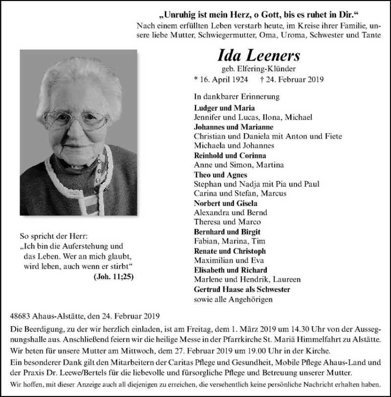 Hier finden Sie alle Traueranzeigen aus der Zeitung, die bisher für Ida Leeners erschienen sind. Weitere Traueranzeigen, die in der Zeitung erscheinen, werden hier ebenfalls aufgelistet