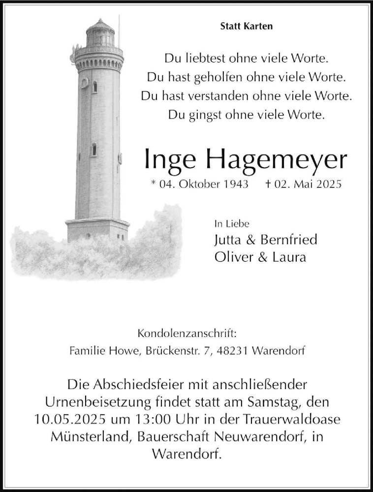 Hier finden Sie alle Traueranzeigen aus der Zeitung, die bisher für Inge Hagemeyer erschienen sind. Weitere Traueranzeigen, die in der Zeitung erscheinen, werden hier ebenfalls aufgelistet