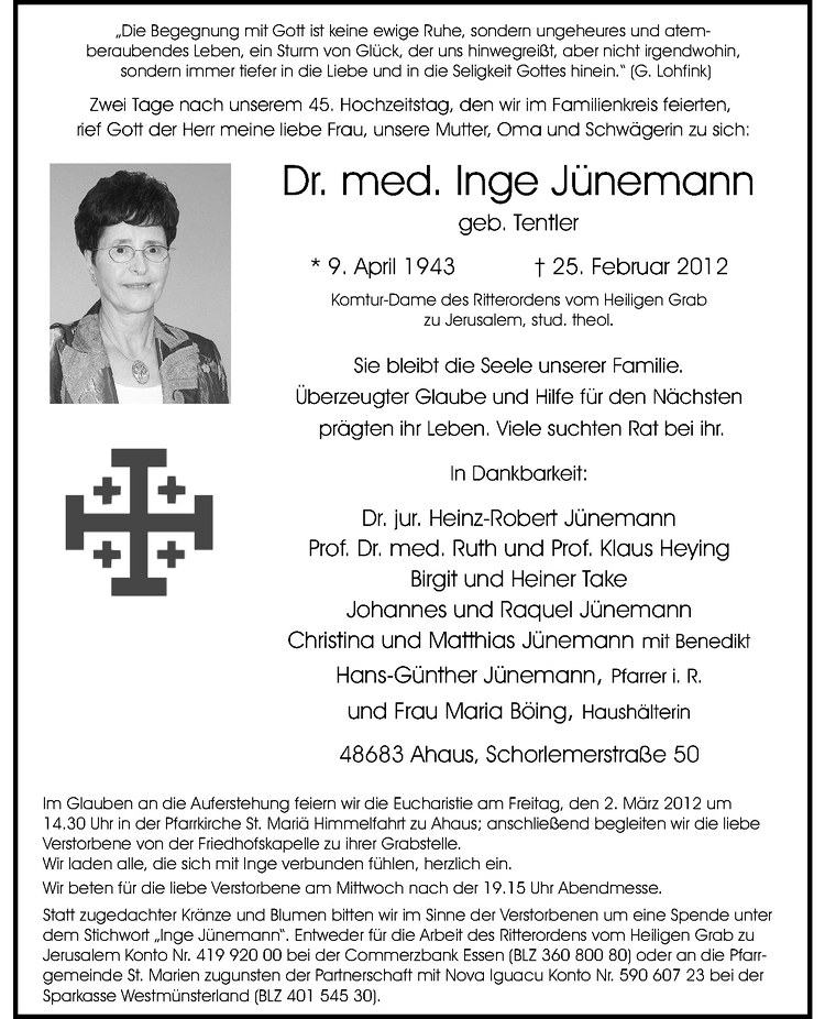 Hier finden Sie alle Traueranzeigen aus der Zeitung, die bisher für Inge Jünemann erschienen sind. Weitere Traueranzeigen, die in der Zeitung erscheinen, werden hier ebenfalls aufgelistet