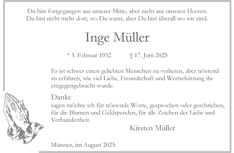 Hier finden Sie alle Traueranzeigen aus der Zeitung, die bisher für Inge Müller erschienen sind. Weitere Traueranzeigen, die in der Zeitung erscheinen, werden hier ebenfalls aufgelistet