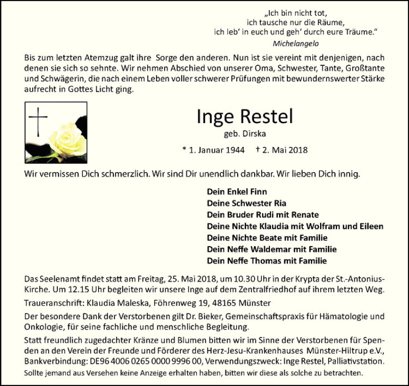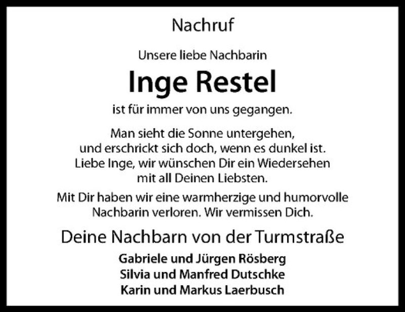 Hier finden Sie alle Traueranzeigen aus der Zeitung, die bisher für Inge Restel erschienen sind. Weitere Traueranzeigen, die in der Zeitung erscheinen, werden hier ebenfalls aufgelistet