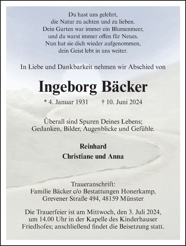 Hier finden Sie alle Traueranzeigen aus der Zeitung, die bisher für Ingeborg Bäcker erschienen sind. Weitere Traueranzeigen, die in der Zeitung erscheinen, werden hier ebenfalls aufgelistet