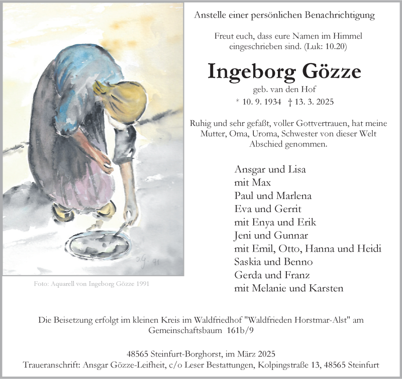 Hier finden Sie alle Traueranzeigen aus der Zeitung, die bisher für Ingeborg Gözze erschienen sind. Weitere Traueranzeigen, die in der Zeitung erscheinen, werden hier ebenfalls aufgelistet