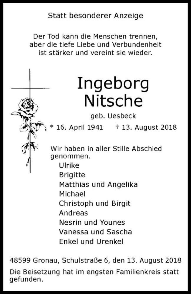 Hier finden Sie alle Traueranzeigen aus der Zeitung, die bisher für Ingeborg Nitsche erschienen sind. Weitere Traueranzeigen, die in der Zeitung erscheinen, werden hier ebenfalls aufgelistet