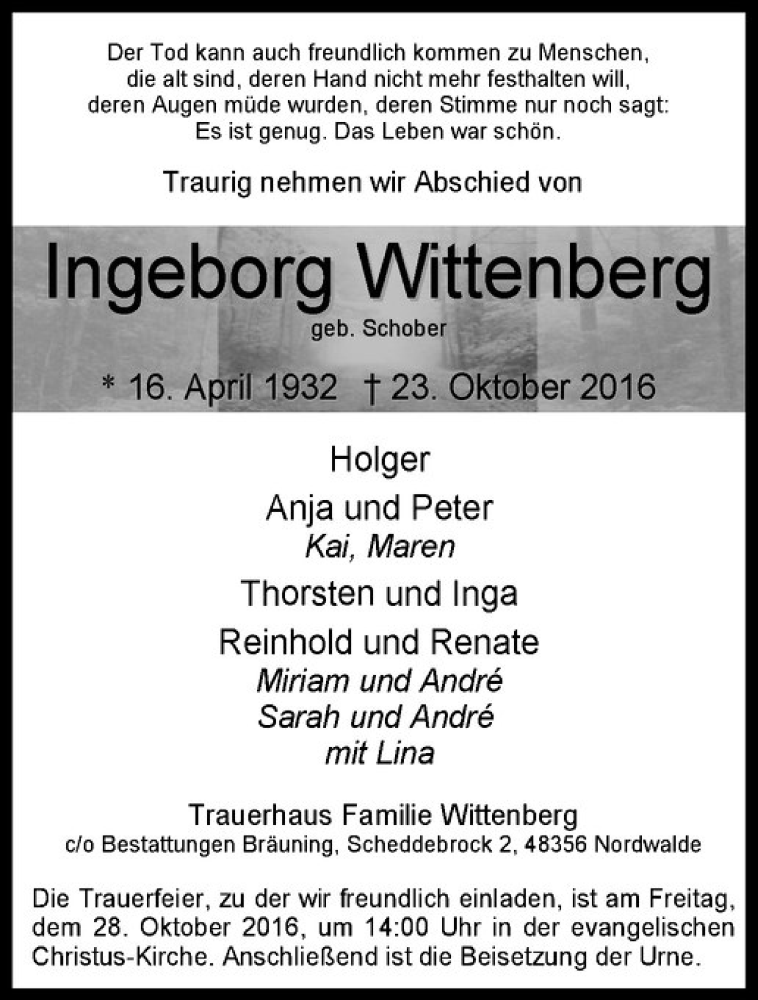 Hier finden Sie alle Traueranzeigen aus der Zeitung, die bisher für Ingeborg Wittenberg erschienen sind. Weitere Traueranzeigen, die in der Zeitung erscheinen, werden hier ebenfalls aufgelistet