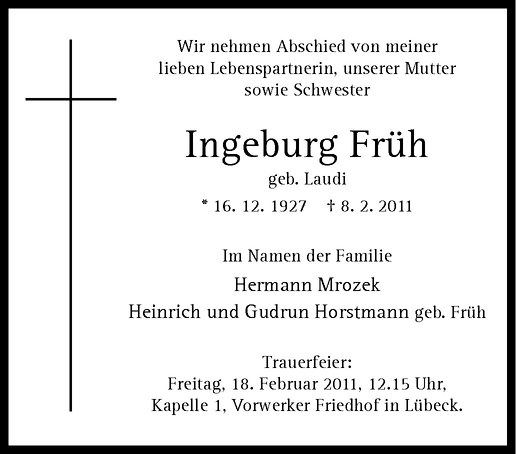 Hier finden Sie alle Traueranzeigen aus der Zeitung, die bisher für Ingeburg Früh erschienen sind. Weitere Traueranzeigen, die in der Zeitung erscheinen, werden hier ebenfalls aufgelistet