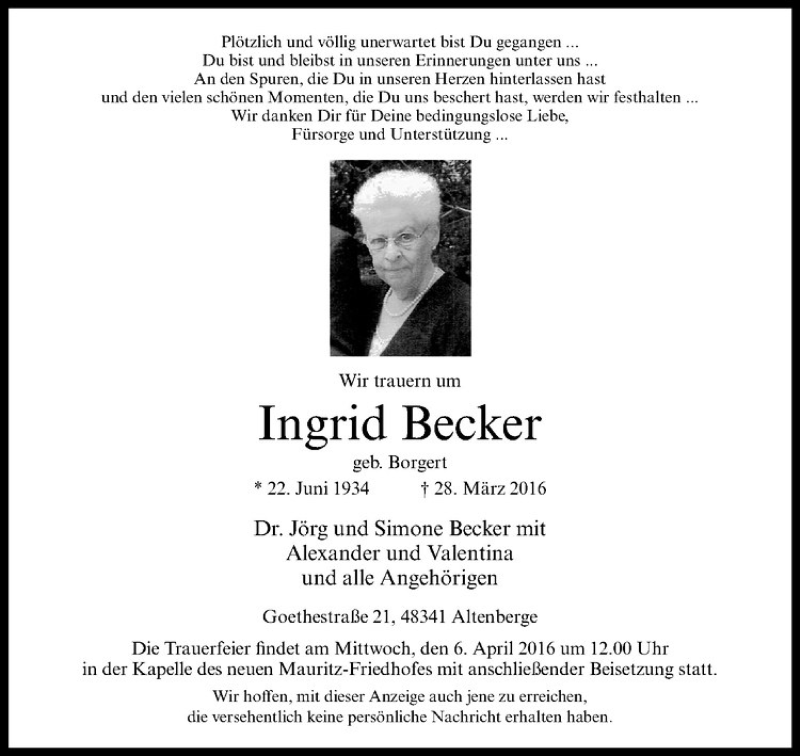 Hier finden Sie alle Traueranzeigen aus der Zeitung, die bisher für Ingrid Becker erschienen sind. Weitere Traueranzeigen, die in der Zeitung erscheinen, werden hier ebenfalls aufgelistet