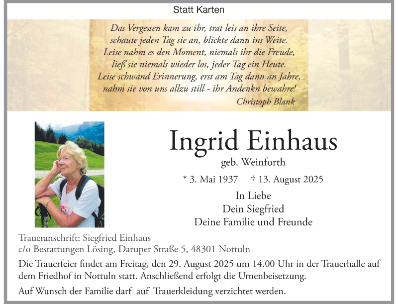 Hier finden Sie alle Traueranzeigen aus der Zeitung, die bisher für Ingrid Einhaus erschienen sind. Weitere Traueranzeigen, die in der Zeitung erscheinen, werden hier ebenfalls aufgelistet