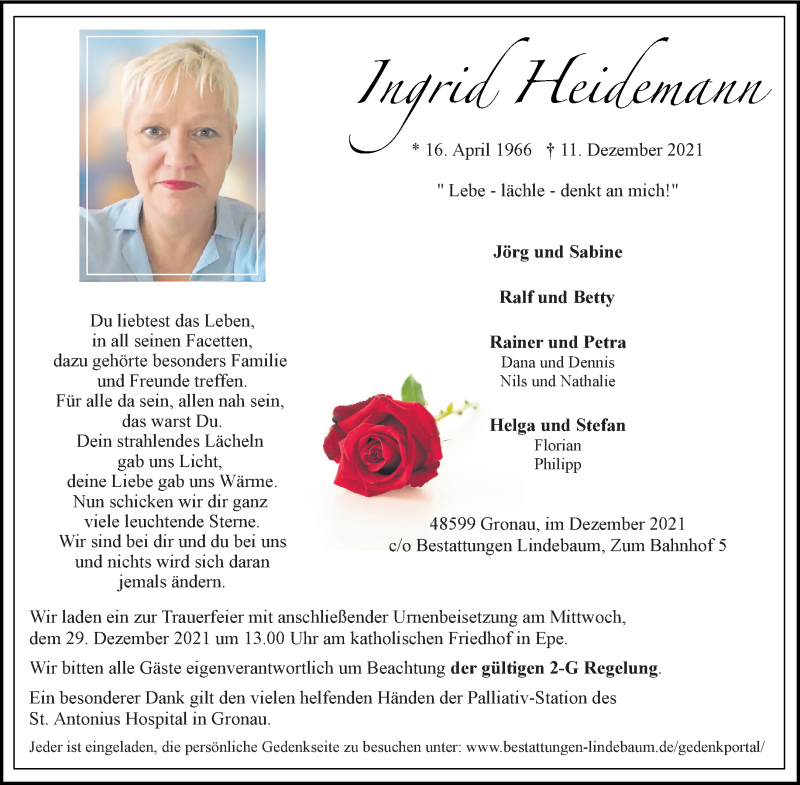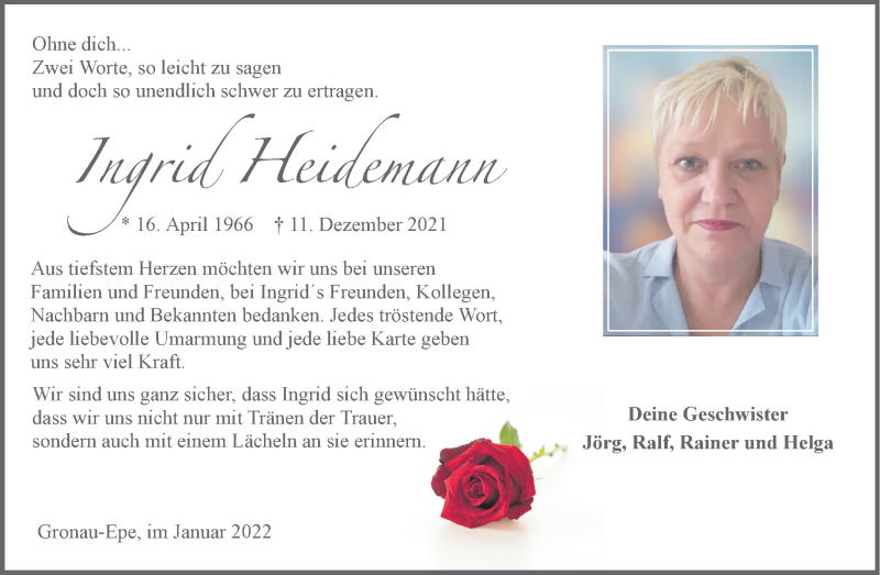 Hier finden Sie alle Traueranzeigen aus der Zeitung, die bisher für Ingrid Heidemann erschienen sind. Weitere Traueranzeigen, die in der Zeitung erscheinen, werden hier ebenfalls aufgelistet