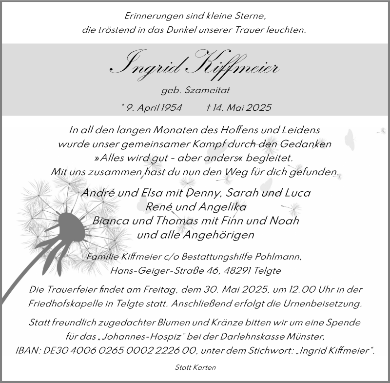Hier finden Sie alle Traueranzeigen aus der Zeitung, die bisher für Ingrid Kiffmeier erschienen sind. Weitere Traueranzeigen, die in der Zeitung erscheinen, werden hier ebenfalls aufgelistet