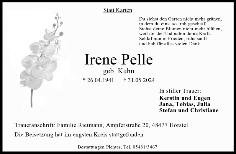 Hier finden Sie alle Traueranzeigen aus der Zeitung, die bisher für Irene Pelle erschienen sind. Weitere Traueranzeigen, die in der Zeitung erscheinen, werden hier ebenfalls aufgelistet