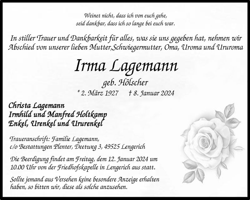 Hier finden Sie alle Traueranzeigen aus der Zeitung, die bisher für Irma Lagemann erschienen sind. Weitere Traueranzeigen, die in der Zeitung erscheinen, werden hier ebenfalls aufgelistet