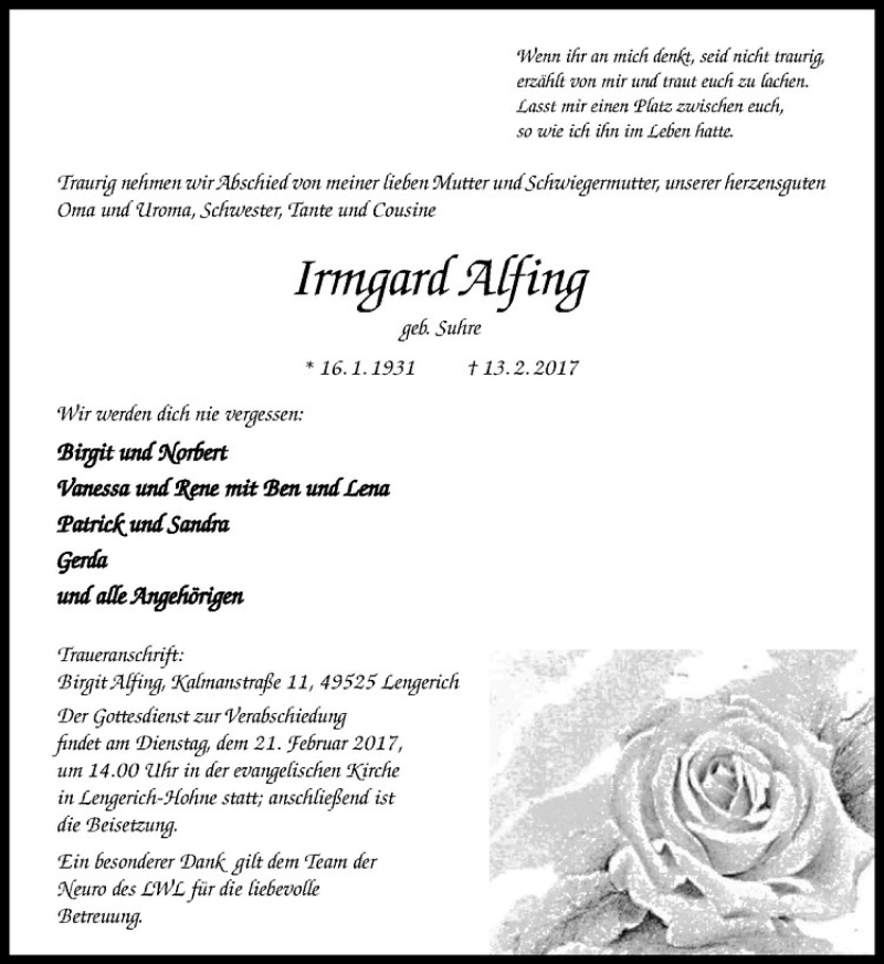 Hier finden Sie alle Traueranzeigen aus der Zeitung, die bisher für Irmgard Alfing erschienen sind. Weitere Traueranzeigen, die in der Zeitung erscheinen, werden hier ebenfalls aufgelistet