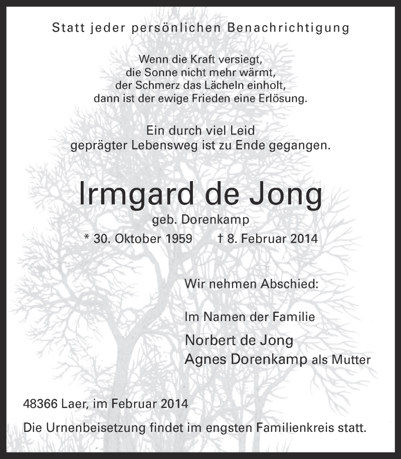 Hier finden Sie alle Traueranzeigen aus der Zeitung, die bisher für Irmgard de Jong erschienen sind. Weitere Traueranzeigen, die in der Zeitung erscheinen, werden hier ebenfalls aufgelistet