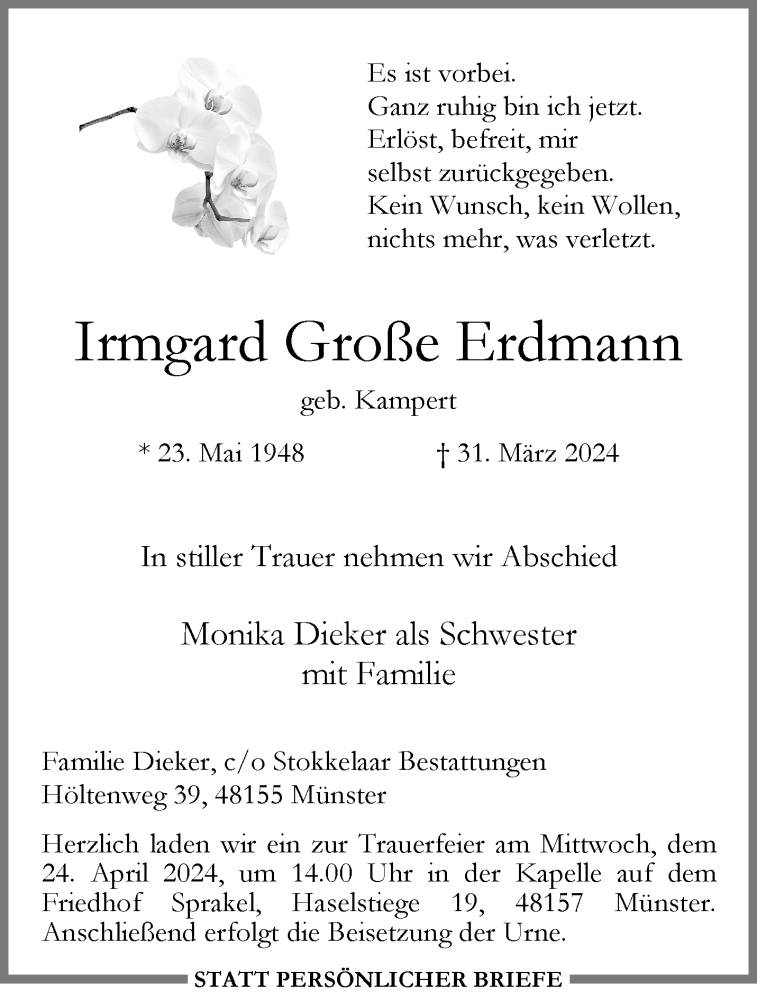 Hier finden Sie alle Traueranzeigen aus der Zeitung, die bisher für Irmgard Große Erdmann erschienen sind. Weitere Traueranzeigen, die in der Zeitung erscheinen, werden hier ebenfalls aufgelistet