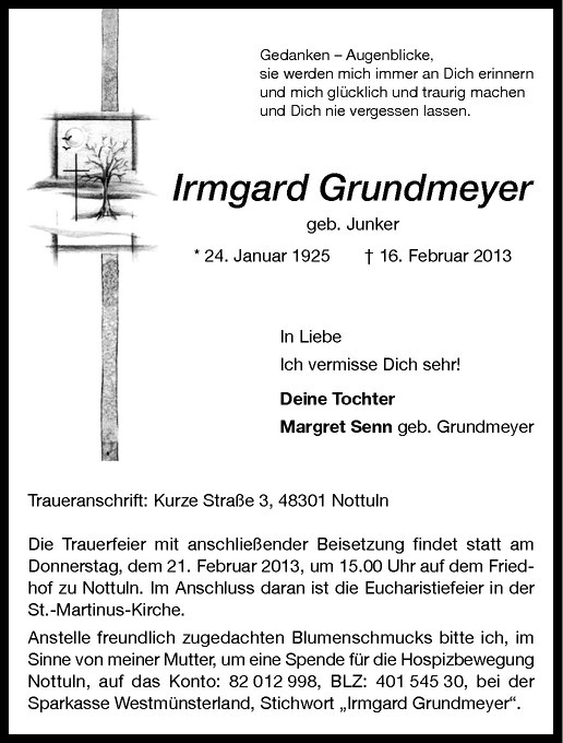 Hier finden Sie alle Traueranzeigen aus der Zeitung, die bisher für Irmgard Grundmeyer erschienen sind. Weitere Traueranzeigen, die in der Zeitung erscheinen, werden hier ebenfalls aufgelistet