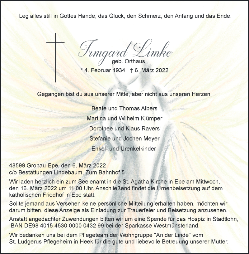 Hier finden Sie alle Traueranzeigen aus der Zeitung, die bisher für Irmgard Limke erschienen sind. Weitere Traueranzeigen, die in der Zeitung erscheinen, werden hier ebenfalls aufgelistet